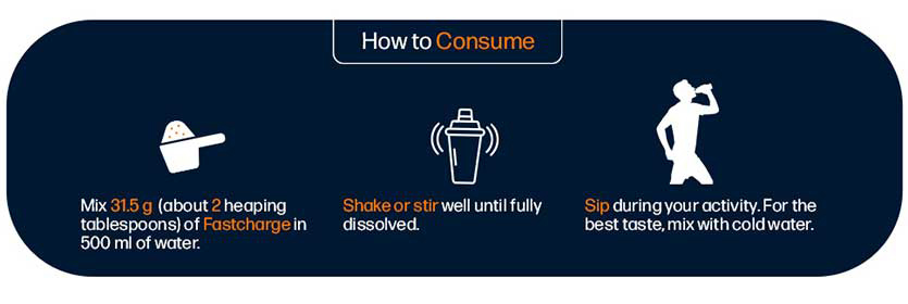 Fill with 500ml of cold water. Add 31.5g (about 2 heaping tablespoons) of FastCharge. Sip throughout your activity. For best taste, use cold water. When to Use: Pre-workout hydration During exercise or sports Post-exercise recovery In hot weather to prevent dehydration